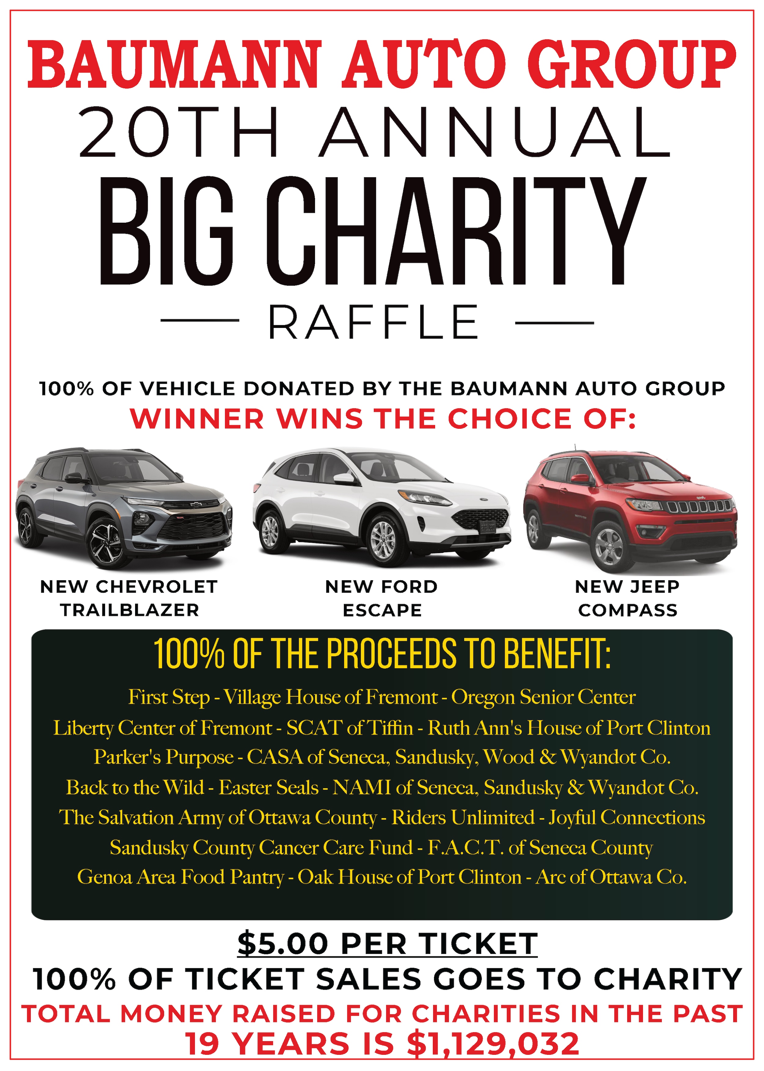 Nineteen area charities will be the big winners from this special event. They include Liberty Center of Fremont, First Step of Seneca, Sandusky, Wyandot & Wood Counties, NAMI of Seneca, Sandusky & Wyandot Counties, Ruth Ann's House of Port Clinton, SCAT of Tiffin, Easter Seals of Northern Ohio, CASA of Sandusky, Seneca & Wyandot Counties, Riders Unlimited, Back to the Wild, The Salvation Army of Ottawa County, Sandusky County Cancer Care Fund, F.A.C.T. of Seneca County, Parker's Purpose, Genoa Area Food Bank, Arc of Ottawa Co., Oak House of Port Clinton, Oregon Senior Center, Joyful Connections and Village House of Fremont. The Baumann Auto Group dealerships and the twenty charities will be selling $5 raffle tickets for a chance to win a new vehicle. 100% OF EVERY TICKET SOLD WILL GO TO THE CHARITIES! The Baumann Auto Group is donating a new vehicle for the Grand Prize. The winner will have the choice of a New Ford Escape, New Chevrolet Trailblazer or a New Jeep Compass. The winning ticket will be drawn November 12, 2022, 1:00pm at Baumann Auto Center in Port Clinton Ohio.